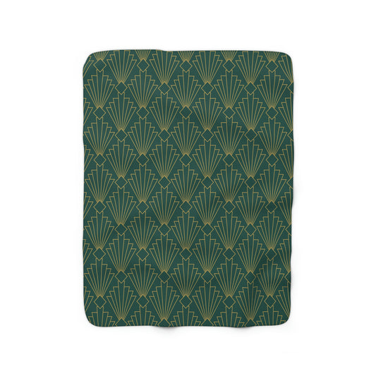 Sherpa Fleece Blanket with Art Deco Gold and Green Chevron Design
